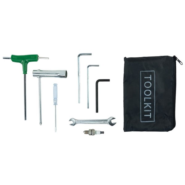 - Kit includes T-style hex wrenches ( 4 mm, 5 mm short, 5 mm long), spark plug wrench with cross tip screwdriver, flat tip screwdriver, hex wrenches ( 4 mm, 5 mm, 6 mm), open-end wrench ( 8 mm, 10 mm), spark plug, and tool bag