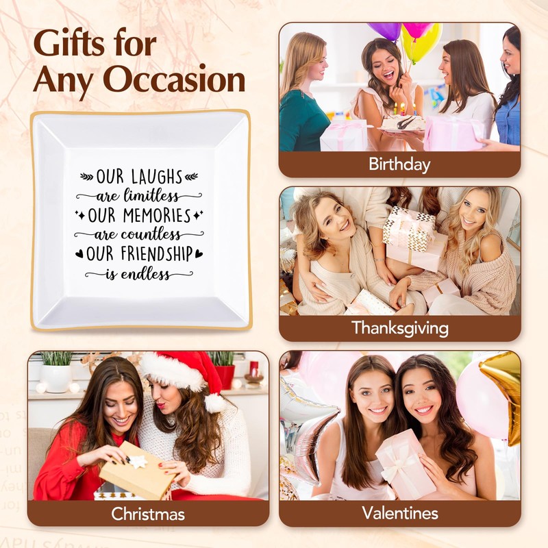 - ❤【Best Friend Gifts】 "Our laughs are limitless, our memories are countless, our friendship is endless" Special designed friend-themed ring trinket dish for a female friend, as a unique long-distance friendship gift to remind your friends that no matter how distant it is, you always keep her in mind, the precious friendship between you. Best friend gifts for women whose birthday, wedding, Christmas, Valentine's day, graduation, retirement, going away, or new job gift.