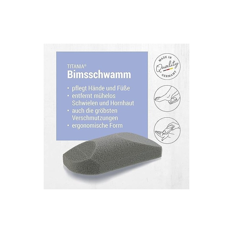 - Handy pumice sponge – the TITANIA pumice sponge with its handy shape ensures skin-friendly hand and foot care by gently and thoroughly removing calluses and calluses and calluses as well as coarsest dirt. A must-have for soft and gentle feet and hands.