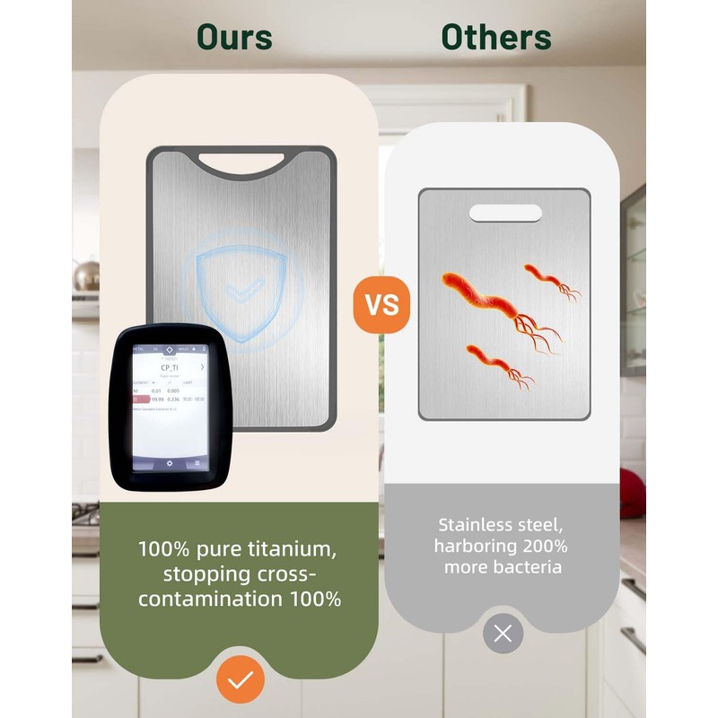 - BUILT TO LAST IN BUSY KITCHENS - Unlike wooden or plastic boards that absorb stains and odors, the titanium surface stays smooth and scratch-free, even after years of holiday feasts, BBQ prep, and daily cooking sessions.