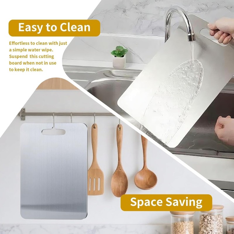 - 【Healthier and Safer】Our cutting boards are made of 100% pure titanium, which is a trusted material for surgical implants. Unlike wooden and plastic cutting boards, pure titanium cutting board do not absorb liquids, and are easy to clean,do not leave any odors or subtle food residues, making them a healthy choice for your kitchen