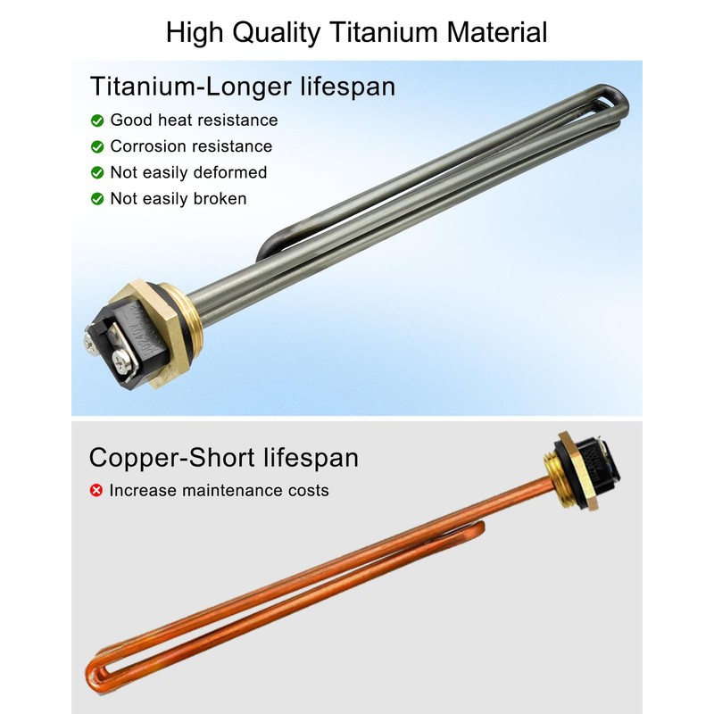 - High Melting Point Titanium: Water heating element replacement is made of titanium tube materials, the melting point of titanium is about 3034℉ (1668℃), has better heat resistance, excellent corrosion resistance, and excellent oxidation resistance, compared to the melting point of about 1985℉ (1085℃) of copper, easier to maintain structural integrity, better toughness, more durable performance