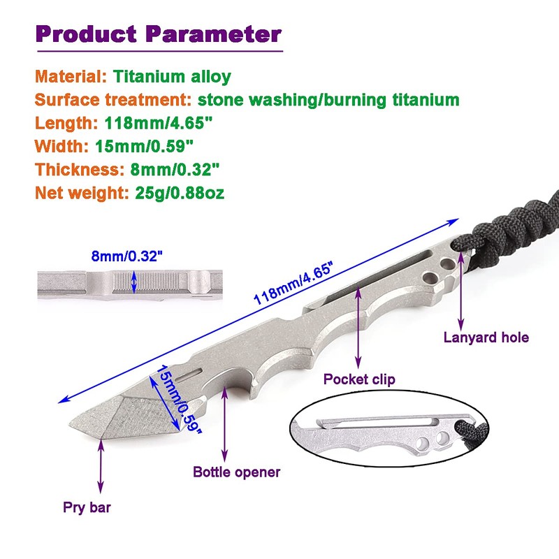 - [Portable]: The titanium pry bar has a pocket clip and a lanyard hole, which is easy to carry, and it will be a practical tool at your fingertips in various situations.