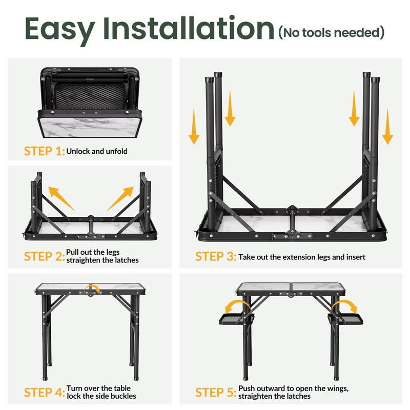 - Simple 5-step Installation (No tools needed). Step 1: Unlock and unfold. Step 2: Pull out the legs and straighten the latches. Step 3: Take out the extension legs and insert. Step 4: Turn over the table and lock the side buckles. Step 5: Push outward to open the wings, straighten the latches. Done. Please refer to the installation steps in the picture.