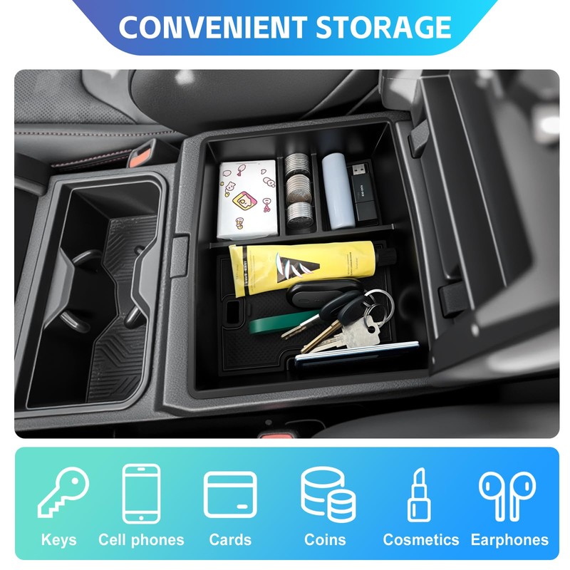 This center console organizer tray is compatible with 2024-2025 Toyota Tacoma. It can turn your armrest storage space into a clutter free area. It is made of ABS material, which is beautiful and durable, and maximizes the use of space without sacrificing the style of the pickup truck itself. It is very suitable for off-road travel or daily commuting, ensuring the safety of items such as phones, keys, and cards when the vehicle is bumpy.
