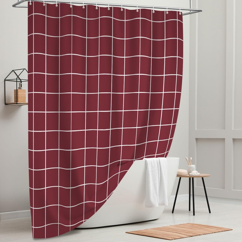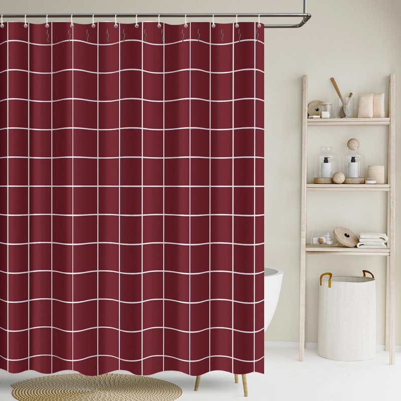 Tititex Net Burgundy Grid Plaid Minimalist Shower Curtain, White Line Simple Modern Shower Curtain Sets Decoration 71x71 Inch with Hooks