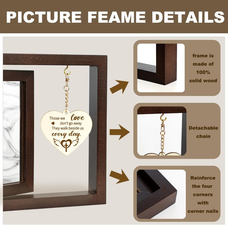 - đăFrame Designă Our picture frame is made of 100% solid wood, Differ from traditional photo frame, this gifts features a 360° rotating picture frame and a heart-shaped wood sign hanging beside. It allows you to display 2pcs 4x6 inches ' s photos simultaneously