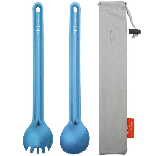 TiTo 2Pcs Titanium Spork Ultralight Long Handle Spoon Fork Portabale Tableware for Outdoor Camping & Hiking Backpacking Flateware with Bag (Bright Blue)