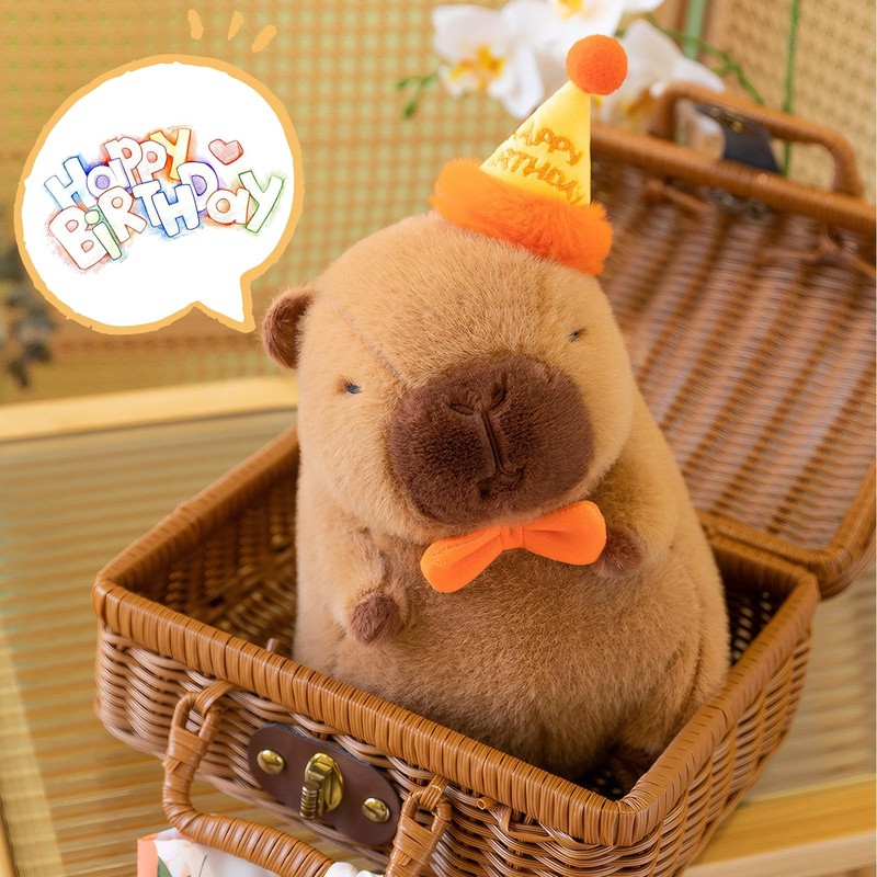 - Fun Birthday Capybara Plush: This soft capybara stuffed animal is designed with a birthday theme, It has a birthday hat on its head and a cute bow tie on its neck. Its interesting appearance can bring people happiness