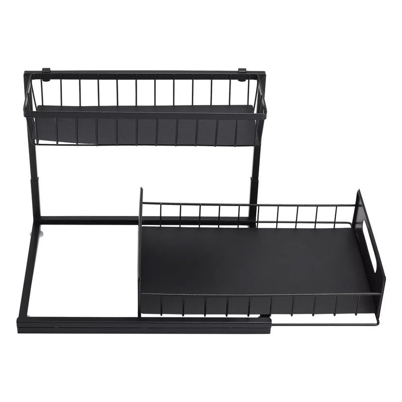 - [VERSATILE STORAGE SOLUTION] This 2-tier slide-out organizer is ideal for under-sink storage needs in both kitchens and bathrooms. With its adjustable metal shelves, it accommodates varying heights of bottles and cans, maintaining pristine organization inside your cabinets.