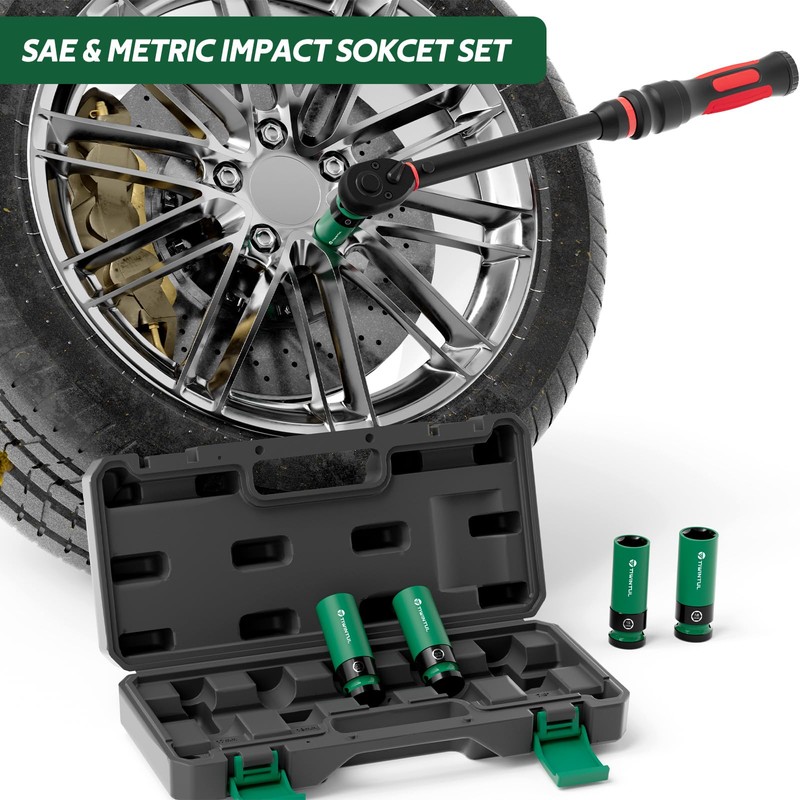 TIWINTUL 1/2" Wheel Protector Impact Socket Set, 5Pcs Non-Marring Lug Nut Socket Set, CR-MO Steel, 6-Point Thin Wall Deep Socket Set, Color-Coded Protective Sleeves- Metric 17 19 21 mm, SAE 13/16 7/8"