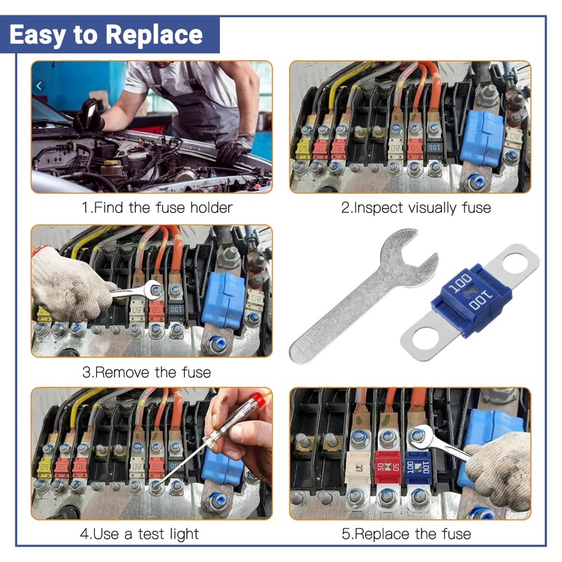 - High capacity fuses: Each fuse in the kit supports up to 100 A, making it perfect for high-current applications in the automotive sector.