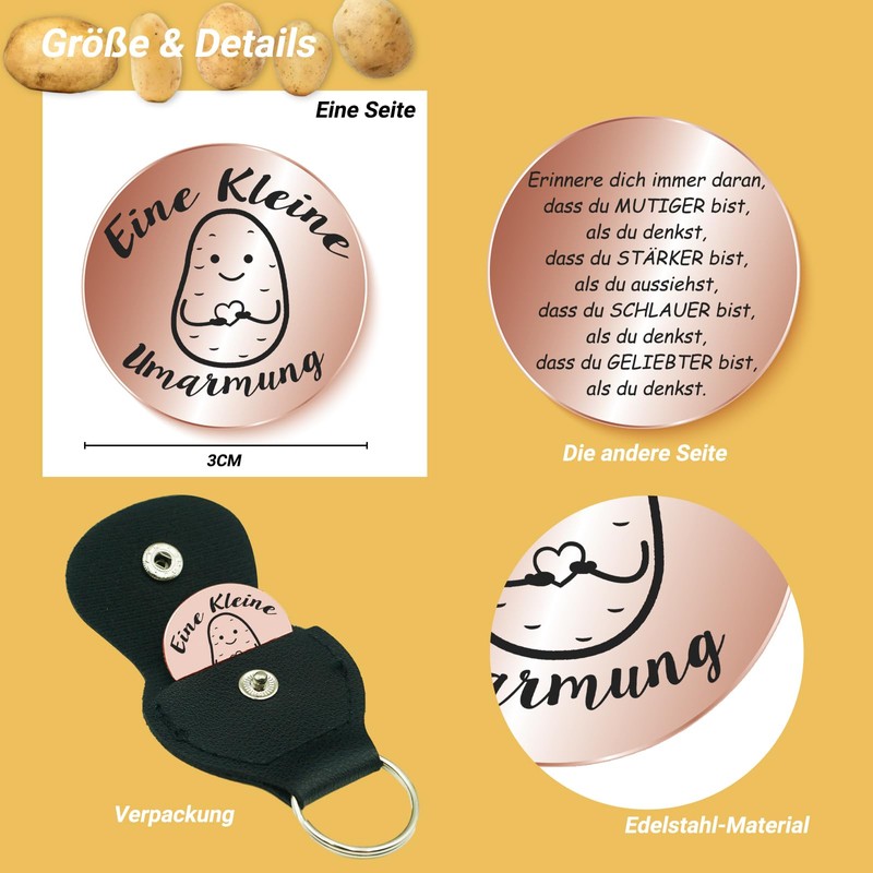 - Coin design: our pocket hug chip has a diameter of 3 cm and is as small as a coin. Made of high quality stainless steel, it will not rust or fade. It is clearly engraved with potato patterns and encouraging words.