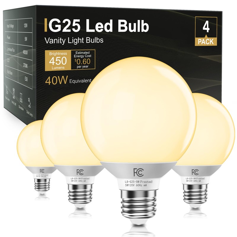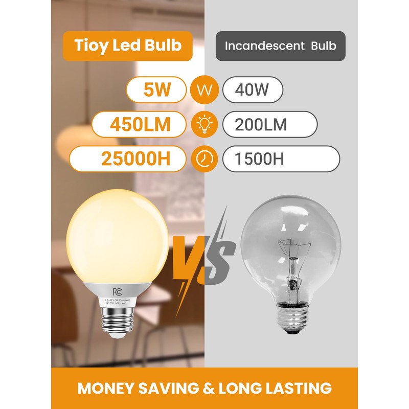 - Energy-Efficient & Long-Lasting: Replace 40-watt incandescent bulbs with 5W G25 LED bulbs. Consuming minimal power, this globe light bulb delivers up to 25,000 hours of bright, reliable light without generating excess heat. Perfect for bathroom vanities or close-up tasks