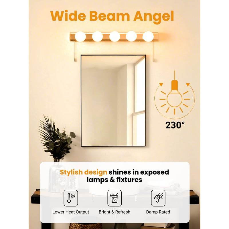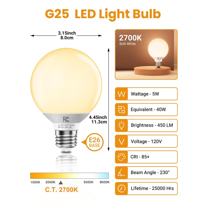 - G25 LED Light Bulb:Ideal Vanity Bulbs for Bathroom,featuring a high-transparency shade, 85+ CRI , and a 230° wide beam angle to provide evenly diffused, soft lighting. They restore true-to-life colors with exceptional clarity, ensuring every detail remains visible for flawless, efficient makeup application