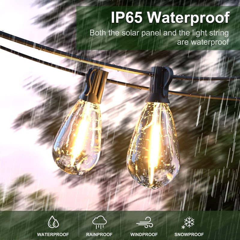 - COMMERCIAL GRADE WEATHERPROOF - Solar Light Outdoor String Lights feature a heavy-duty, durable strand that can withstand extreme weather such as windy, foggy, rainy, snow and extreme temperature weather. When using, please screw the bulbs into the sockets to prevent water from flowing into the interface and reduce the life of the light string.