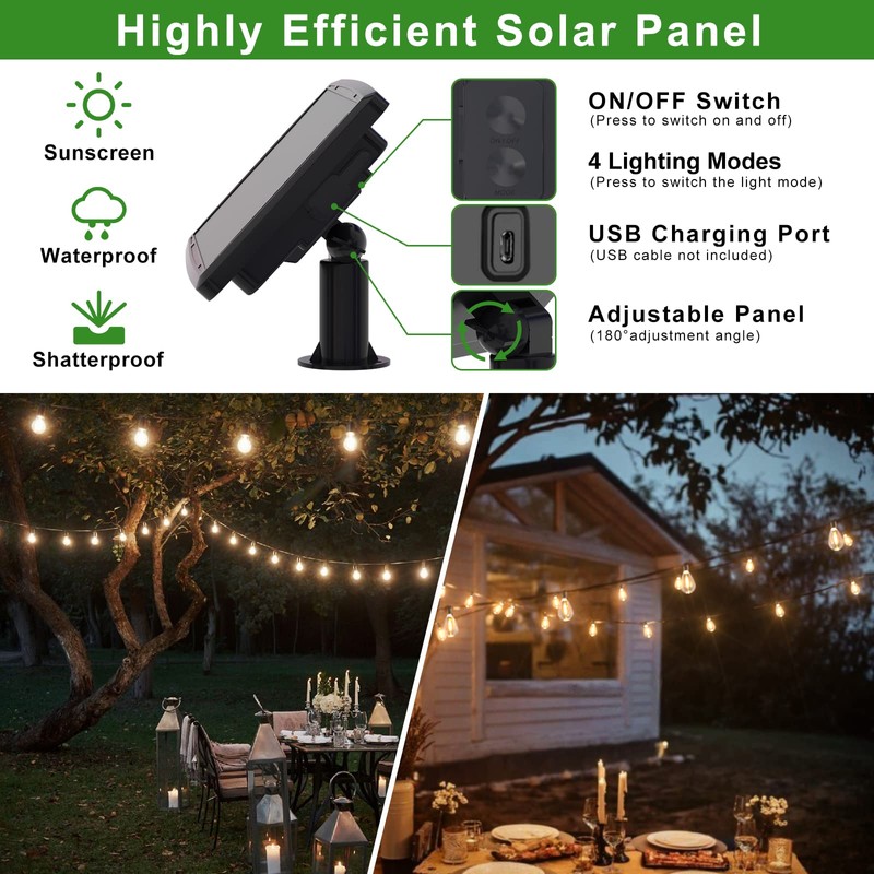 - DURABLE & CONVENIENT - The solar string light is 50ft long with 12 LED bulbs, 1 spare bulb and a 2200mAh polysilicon solar panel with an on/off switch on the back. Exposing the solar panel to direct sunlight is best for a full charge, and the extra USB charging port guarantees double battery life without worrying about continuous rainy days.