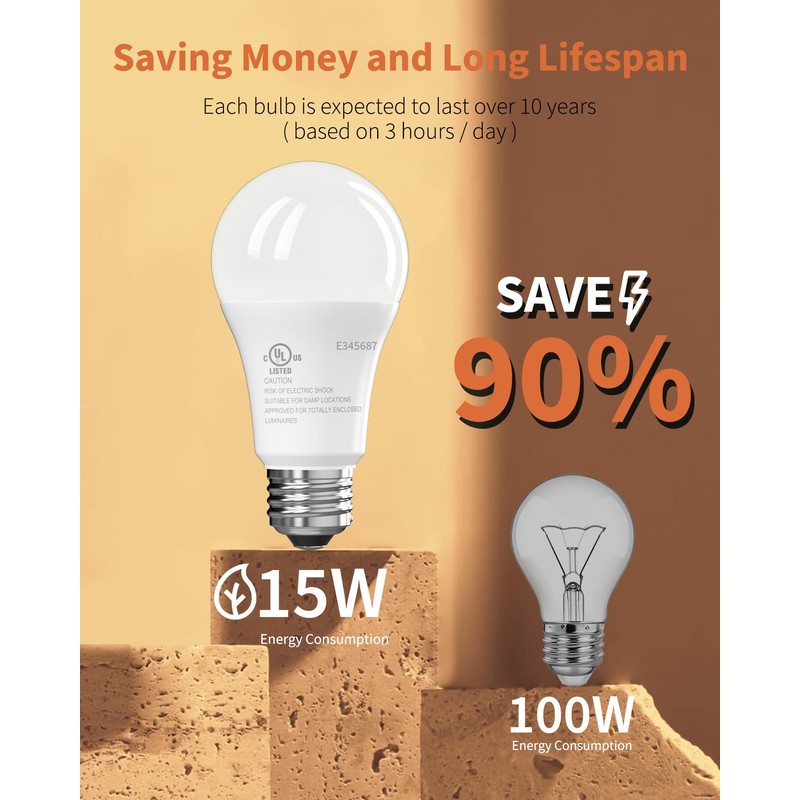 - Directly Reduce Electricity Costs: Save up to 90% on energy costs by replacing 100W incandescent bulbs with just 15W warm white LED bulbs, without undermining any lighting effects. An estimated energy cost of only $1.81 per year. It provides a comfortable lighting space and protects our visual health at the same time