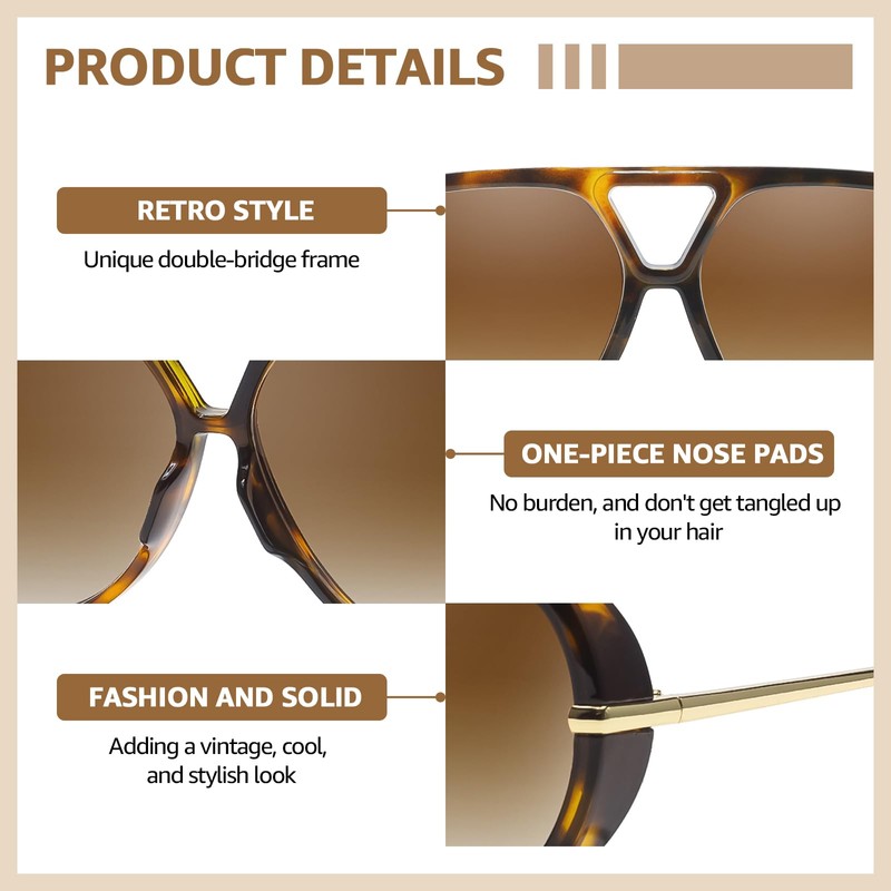 - RETRO DOUBLE BAR AVIATOR STYLE: With an oversized aviator frame and a vintage double bar design, these sunglasses are both vintage and timeless. The sleek metal temples and bold look offer a trendy style, making them a standout accessory for any outfit
