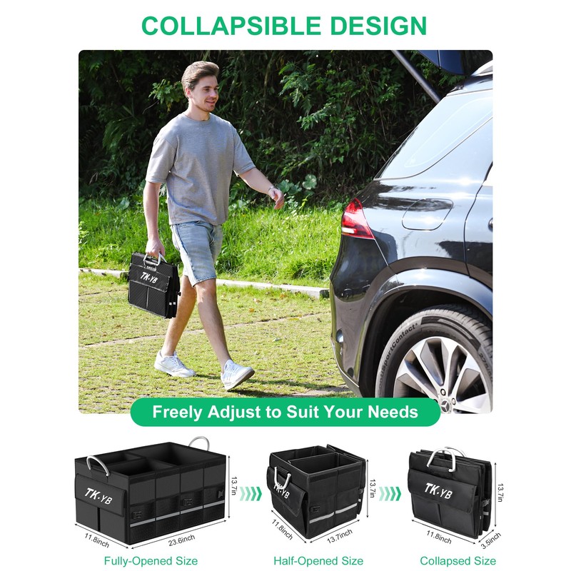 - Flexible Space Management: Come with 3 simple configurations, Fully-opened(23.6"x13.7"x11.8"), Half-fold(13.7"x13.7"x11.8"), or Ultra-compact(13.7"x11.8"x3.5"). Reinforced anti-slip granules covering the entire bottom secure the organizer in SUVs, sedans or trucks without sliding.