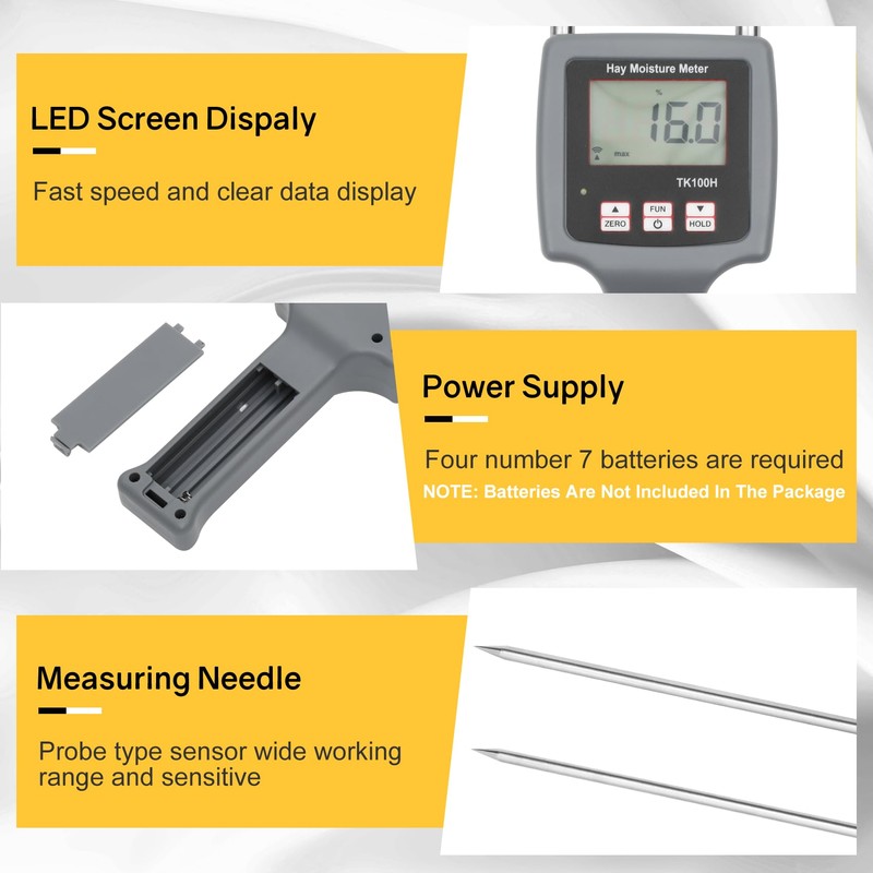 - 【Worry-Free Shopping】NOTE: Batteries are not included in the package, please forgive the inconvenience. Buy our tk100h portable hay moisture meter, we have 7*24 hours after-sales service and half a year warranty. Any questions please contact us via "Order History" - "Contact Seller", we will solve your problem responsibly and give you a satisfactory answer.