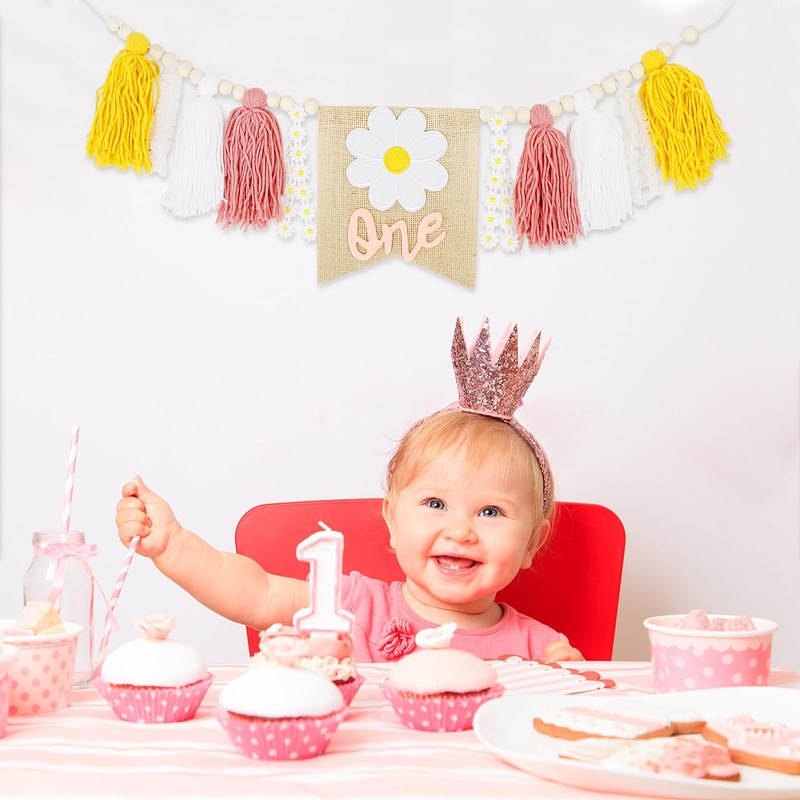 - Hippie 1st birthday decoration banner: this daisy high chair banner is handcrafted with tassels and features a centerpiece of an elaborately embroidered white daisy and a pink "ONE". This design creates an appealing and stylish visual that