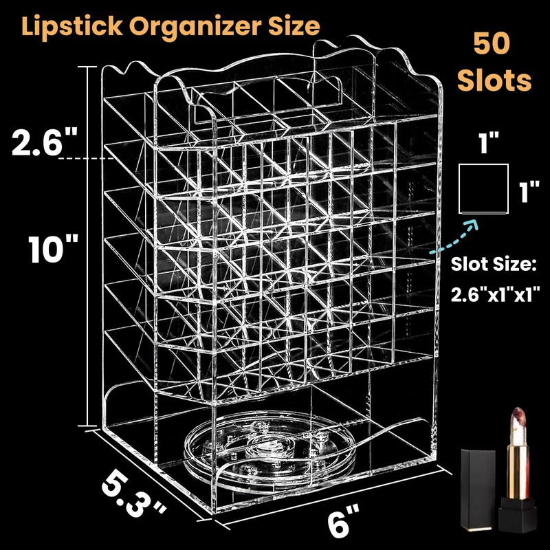 - Large Capacity: Overall size: 10 x 6 x 5.3 inches. Inner slot size: 1 x 1 x 2.5 inches. Contains a total of 50 slots and 4 unrestricted slots on the top and bottom. The acrylic rotating lipstick more than 54 hold up more than 54 lipsticks. Warm Tips: the slots are more suitable for short lipsticks.
