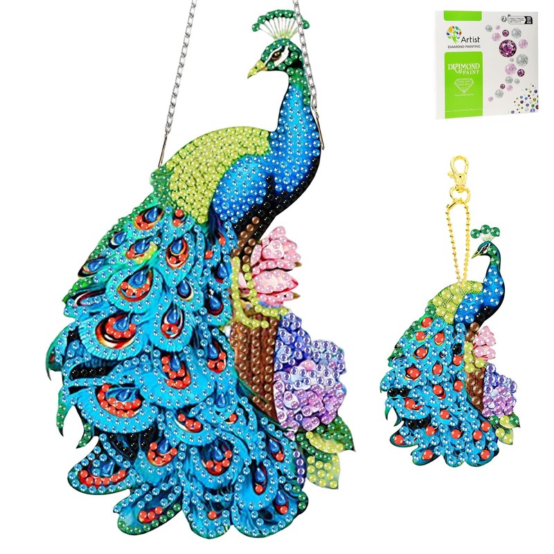 TLIOBLO Hanging Peacock Diamond Art and Key Chains Pendants Boards, Special Shaped Christmas Animal Diamond Painting Hanging Sign with Chain, Double-Sided Ornaments Window Door Home Decor