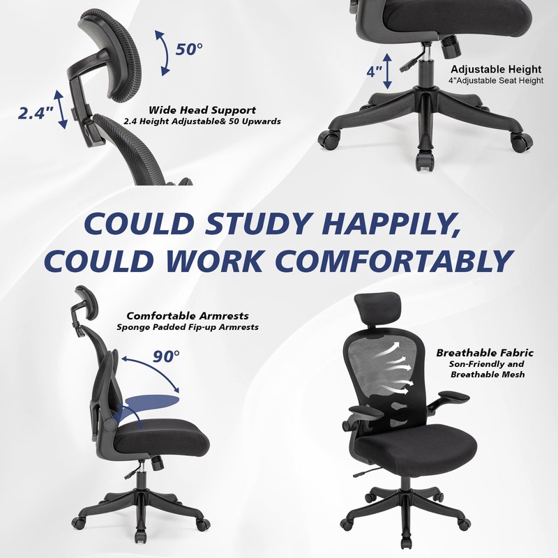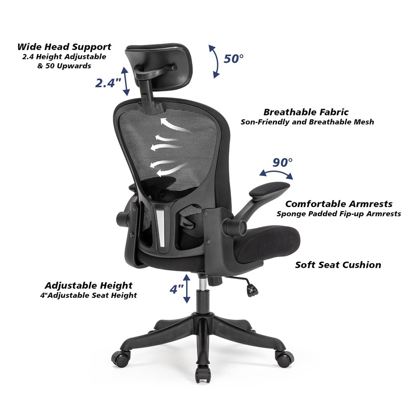 - The chair is ergonomically designed with up and down adjustable armrests, lumbar support that can be adjusted up and down appropriately, a curved mesh backrest that allows you to comfortably lean back in the chair, and removable supportive feet that have a lifting function that can be adjusted to your comfortable height of use. The removable support feet have a lift function and can be adjusted to your comfortable height. The headrest also gives full relaxation to the head.