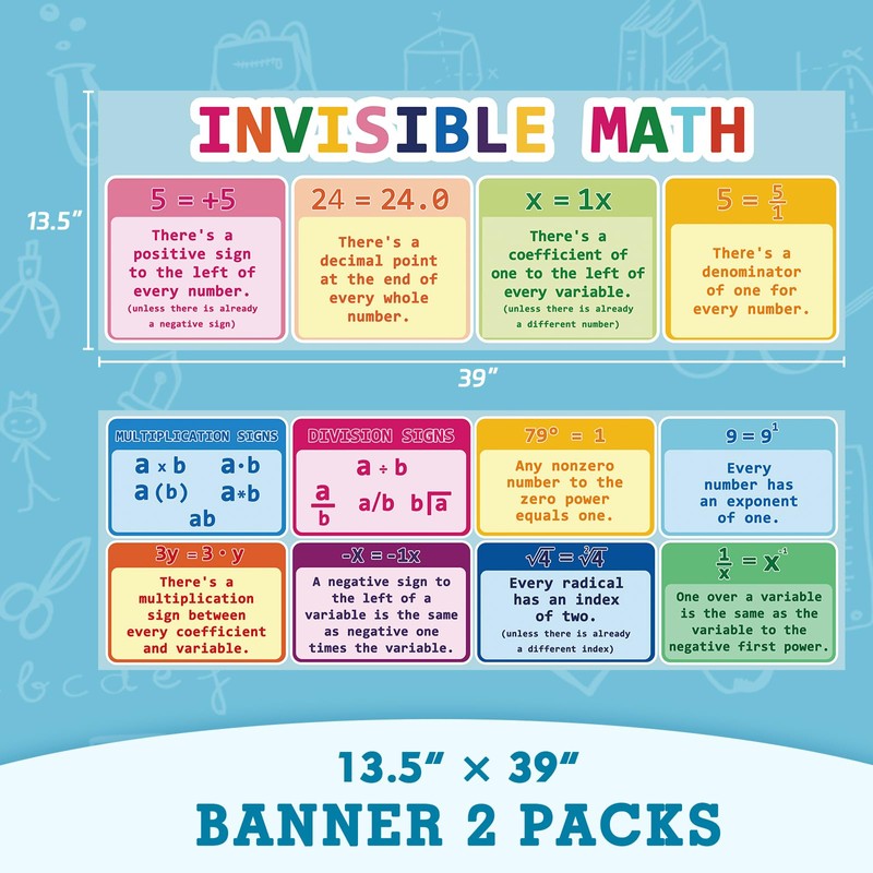 Tlpmsk Educational Math Posters,Large Invisible Math Poster with Dot Glue,13.5”x39” Classroom Banner Decorations for Teachers,2 Pcs(Laminated)