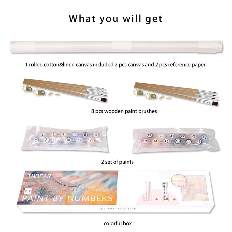 - 【 What Will You Get】Two printed digital oil painting canvases, two sets of brushes and two sets of pigments are packed in a color box.