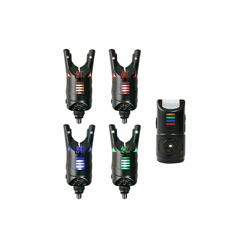TMC Set of 4 x Wireless Carp bite alarms & Receiver. Rolling LED's, 2.5mm Jacks, 20 Second Memory LED, Supplied in a Case