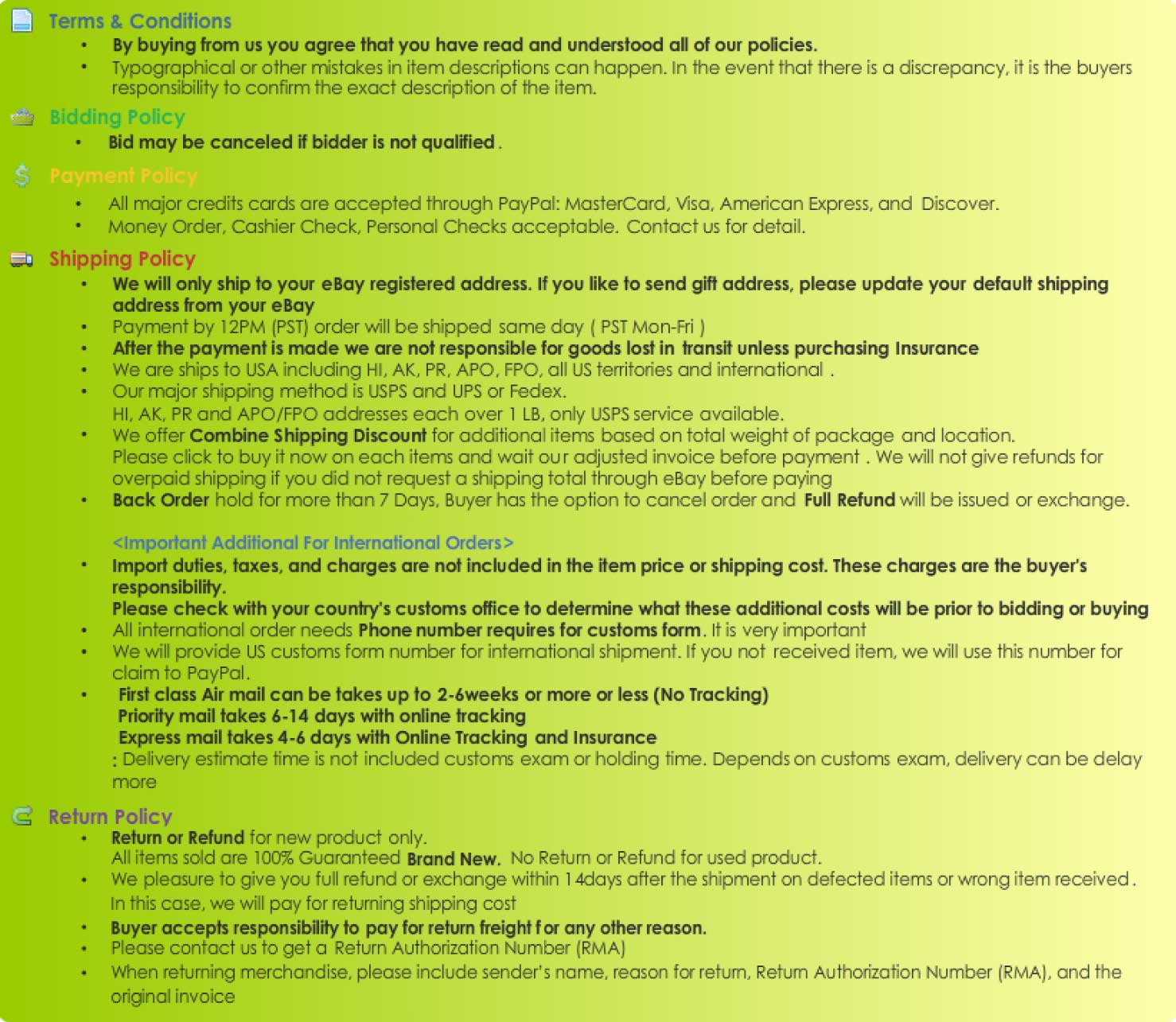 Please read our policy carefully before making a purchase.