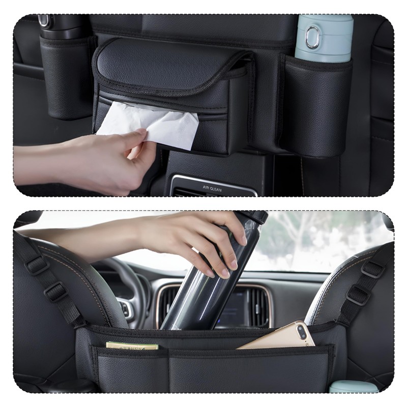 - Practical Function: The large area at the top of this car storage bag can hold slightly larger items such as handbags. The two vertical pockets on the sides can hold water bottles and thermos flasks. The tissue pocket in the middle makes it easy to grab tissues. There are also two small pockets for items such as mobile phones and notebooks. The car storage bag effectively prevents children in the back seat from climbing up and pets from running to the front seat, reducing driving distractions.