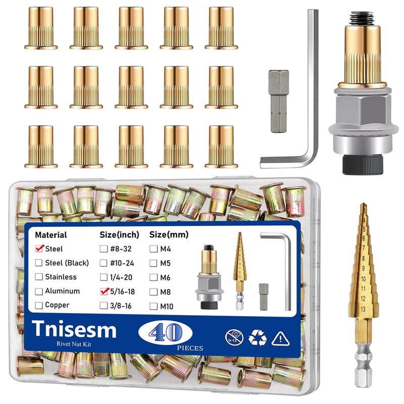 Tnisesm 40Pcs 5/16 Rivet Nut Installation Tool Set, 5/16-18 Carbon Steel Zinc Flat Head Riveter Nutsert Tool Kit