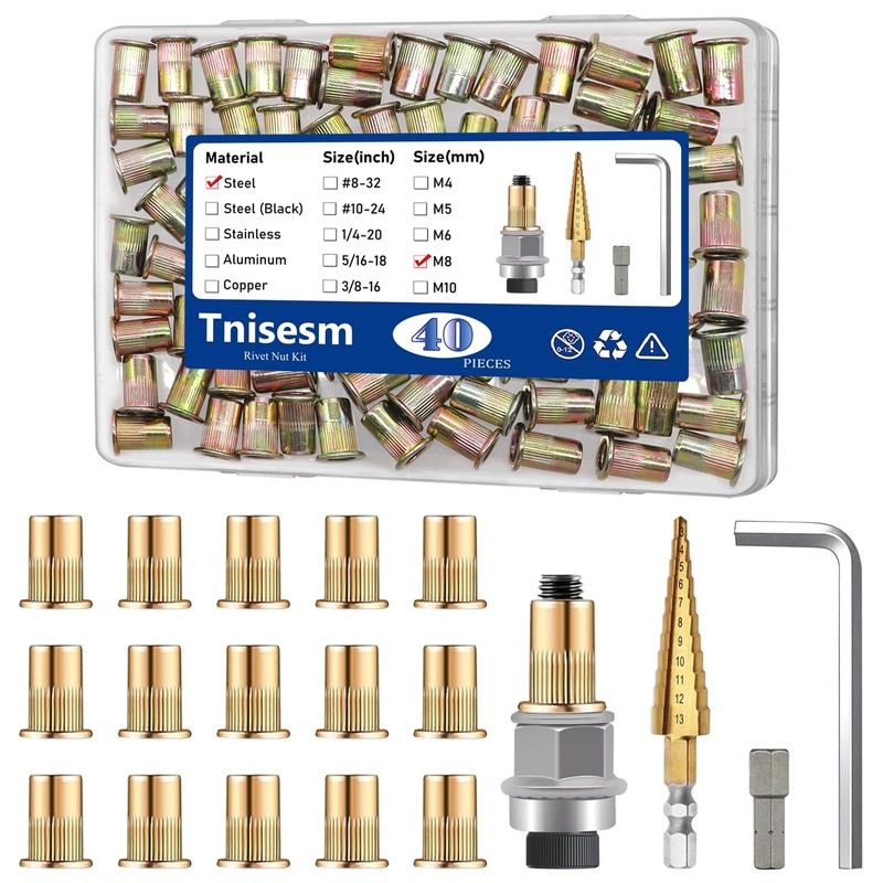Tnisesm 40Pcs M8 Rivet Nut with Rivet Nut Installation Tool, Carbon Steel Zinc Flat Head Riveter Nutsert Tool Kit