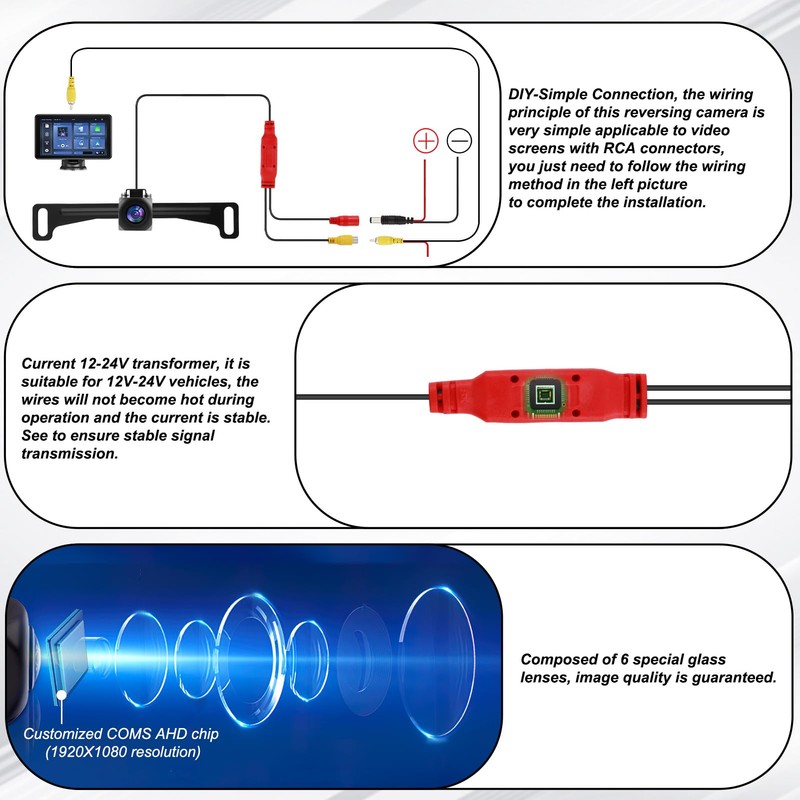 - Dual-Signal Output Flexibility: Default HD output (CVBS signal) works with any screen featuring RCA inputs. For advanced systems, switch to AHD mode via simple coil adjustment to unlock full 720P potential. Note: Verify your display's AHD compatibility before modification. The upgraded chipset maintains stable transmission up to 100ft without signal degradation or electromagnetic interference
