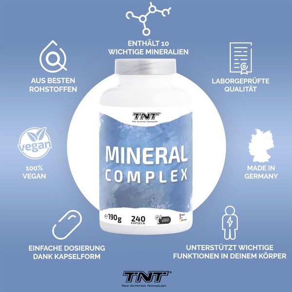 TNT Mineral Complex (240 Capsules) • Mineral Complex High Dose • 10 Minerals & Trace Elements as Electrolytes • Multimineral Complex Laboratory Tested • Made in Germany • 100% Vegan