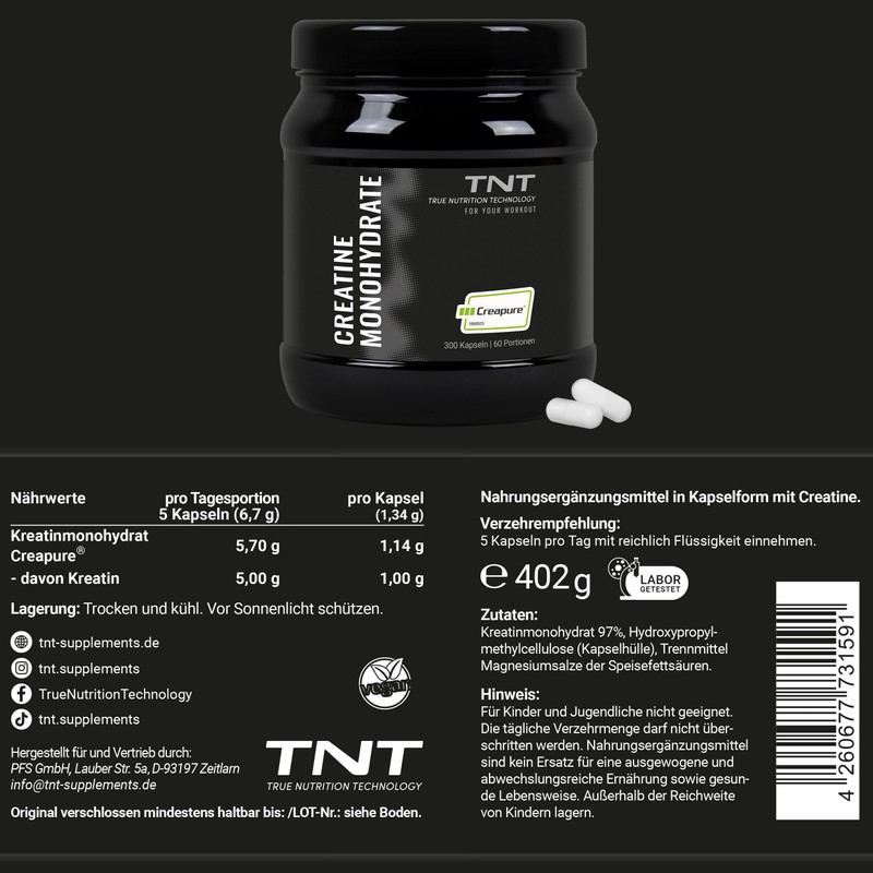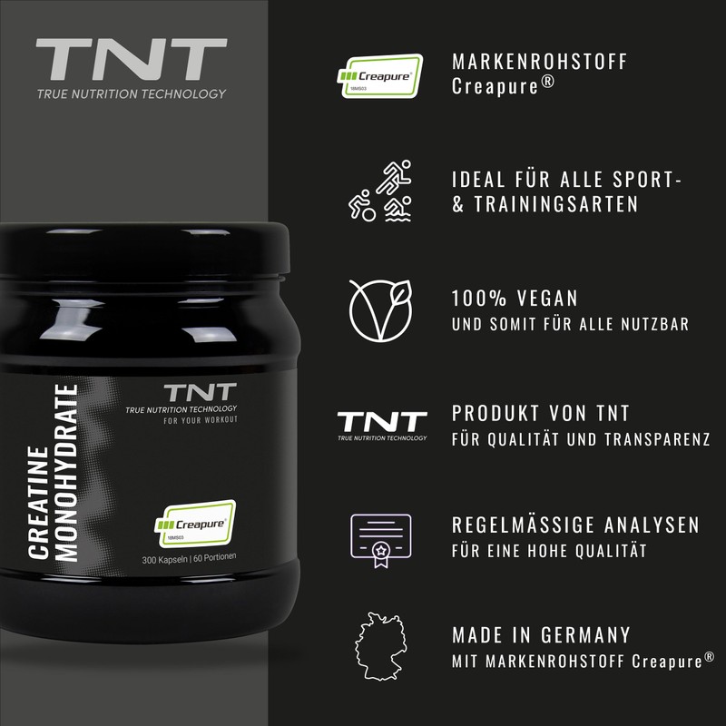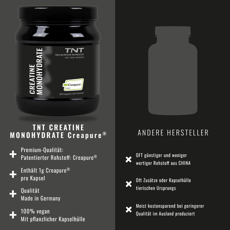 - CREAPURE CREATINE MONOHYDRAT KAPSELN - Die TNT Kreatin Creapure Kapseln sind fr ihren hohen Reinheitsgrad bekannt. Das Premium Supplement mit dem Rohstoff Creapure wird durch ein patentiertes Produktionsverfahren der AlzChem Trostberg GmbH hergestellt und erfllt die h?chsten Qualit?ts-Standards.