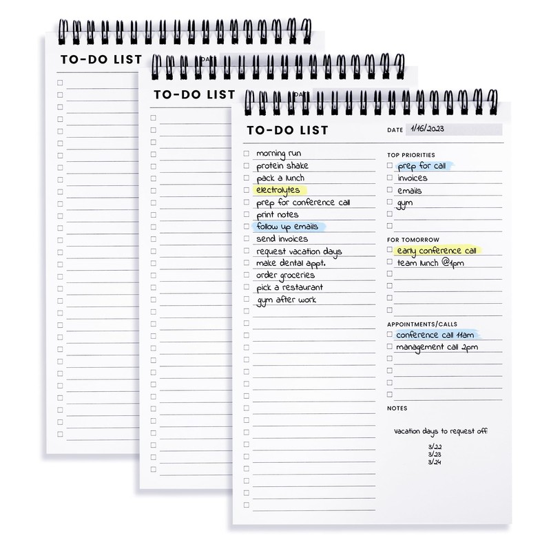 - Spiral Bound with Protective Cover: Our twin spiral-bound notepad lets you start a new page while keeping old ones for reference. It makes it easy to flip through your to-do list. Want to remove your lists when you’re done? No problem! They can be torn out as needed. When you're on the go, the plastic cover on our notepad protects the pages from spills, scratches, and tears. Even better, the cover is see-through so you can quickly glance at your to-do list page as you go about your day.