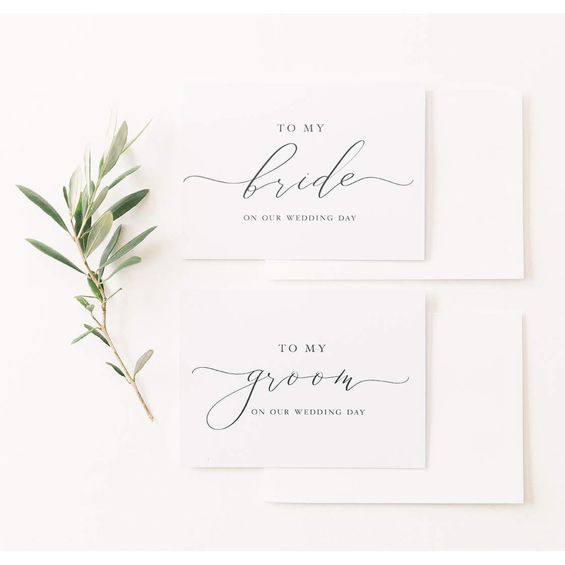 To My Bride To My Groom On Our Wedding Day Card 4x5.5 Folded White Card with Black Caligraphy with Gold Foil Lined Envelopes 2 Card Set Vow Cards Elegant Minimalist Style Wedding Cards