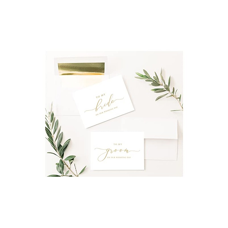 - Wedding day cards. White with elegant gold lettering and gold foil lined envelopes