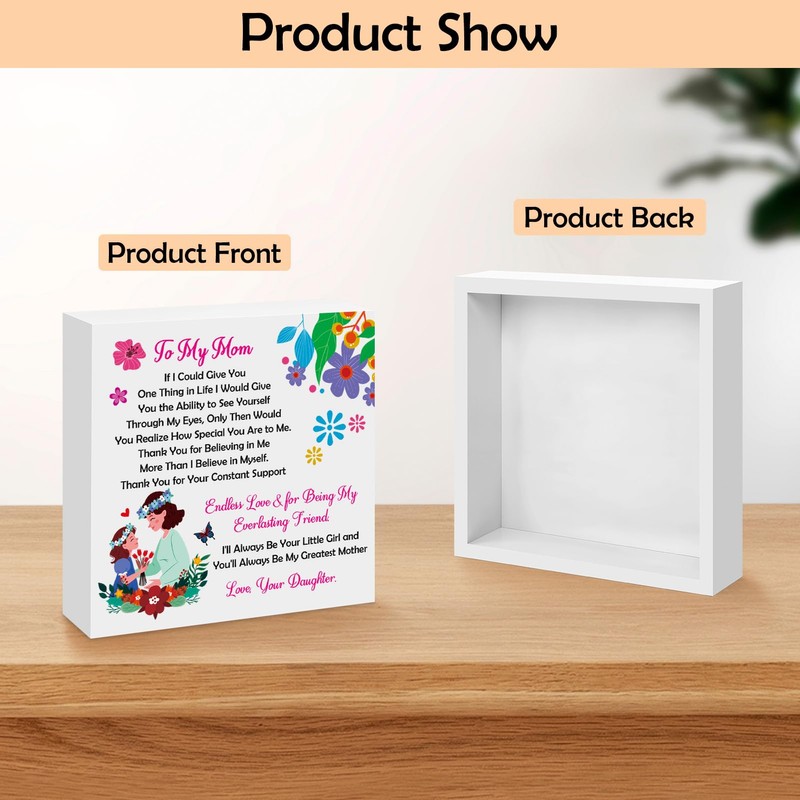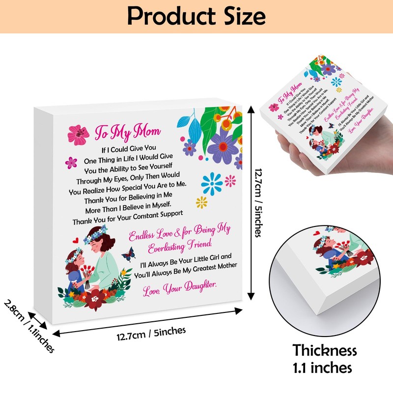 - Mom Themed Wooden Plaque:5"x5"x1.1" square sign decor, Perfectly sized to add class to your favorite little spot. This wooden box sign is made of high-quality wood materials ,it does not break or deform easily, and the surface is smooth and comfortable to touch, the patterns and words are clearly printed, which will bring nice visual enjoyment and ideal decoration effect.