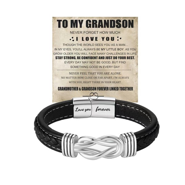 To My Son/Grandson Bracelet From Mom Grandmother, Infinity Knot Black Braided Leather Forever Linked Together Inspirational Bracelet Engraved Love You Forever Birthday Gift Jewelry (Grandson-1)