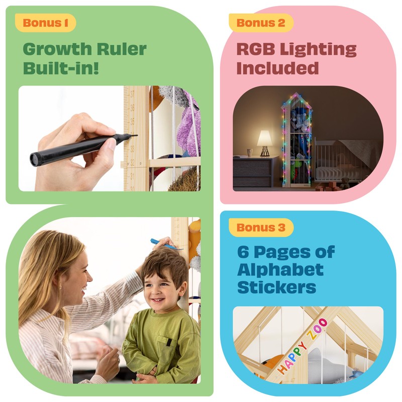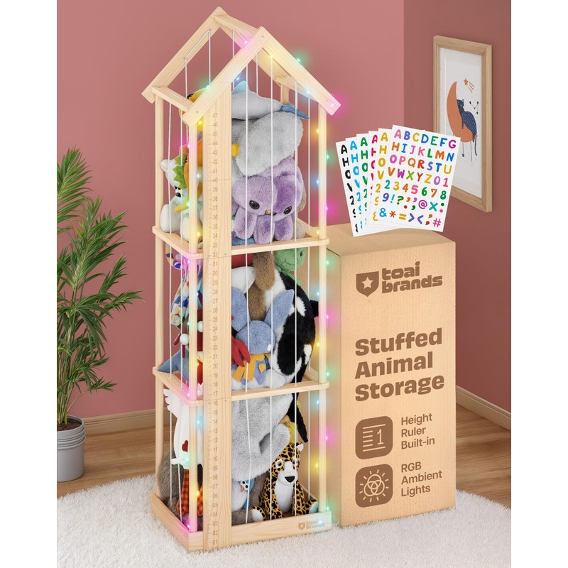 Toaibrands Stuffed Animal Zoo Storage Cage | Wooden Plush Tower Storage | Durable Plush Toy Stuffie Holder | Vertical Jail Organizer With Height Ruler, Stickers & Rgb Light (Large)