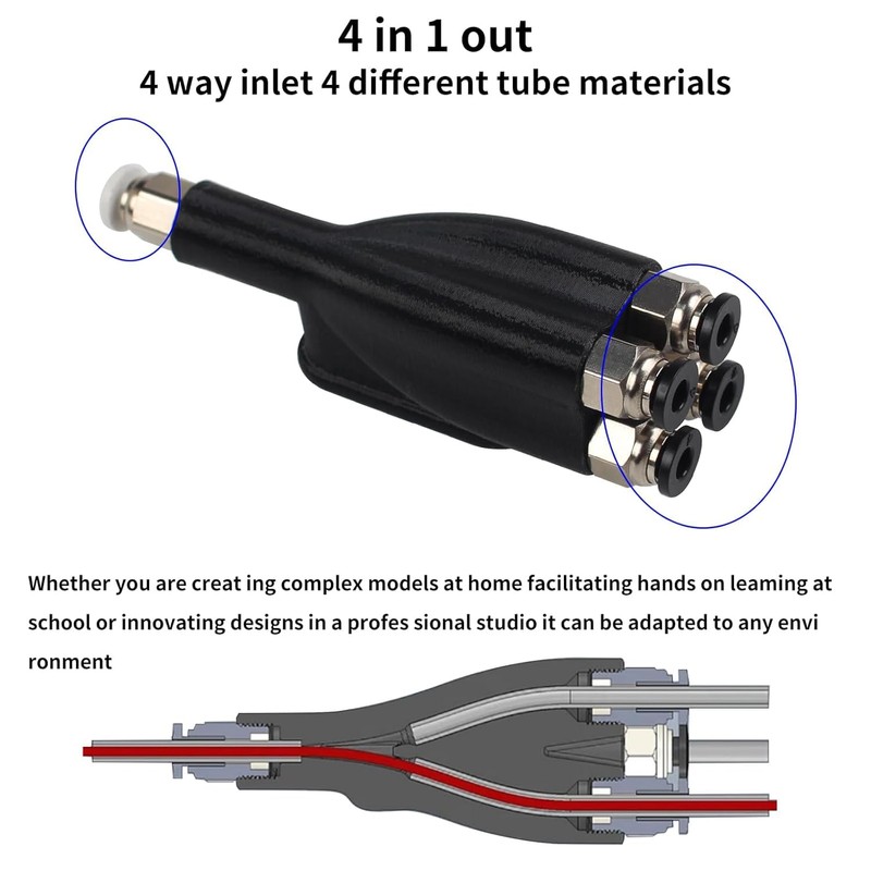 • The 4-in-1 PTFE adapter is an adapter used to connect the PTFE tubing, can connect 4 feeder modules to the printer at the same time (4 ams box inserted into the adapter, can achieve 16 colours printing)