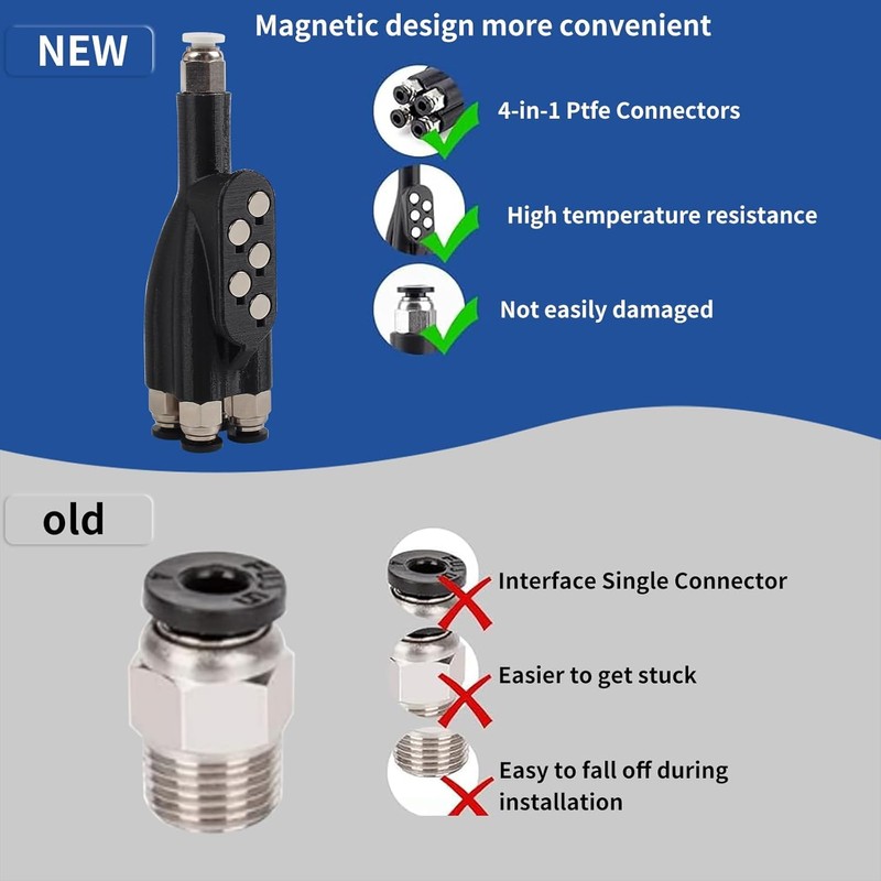 • Easy to install, this adapter has 5 magnttic suction points, you only need to insert the appropriate pipe model into both ends of the connector and attach it to the iron sheet of the printer. You can fix it without using additional fixers and screw