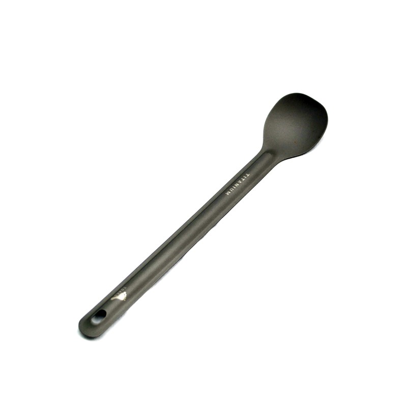 Ultralight titanium long handle spoon with matte finish. Long handle and flat head make it easy to reach corner in bottle