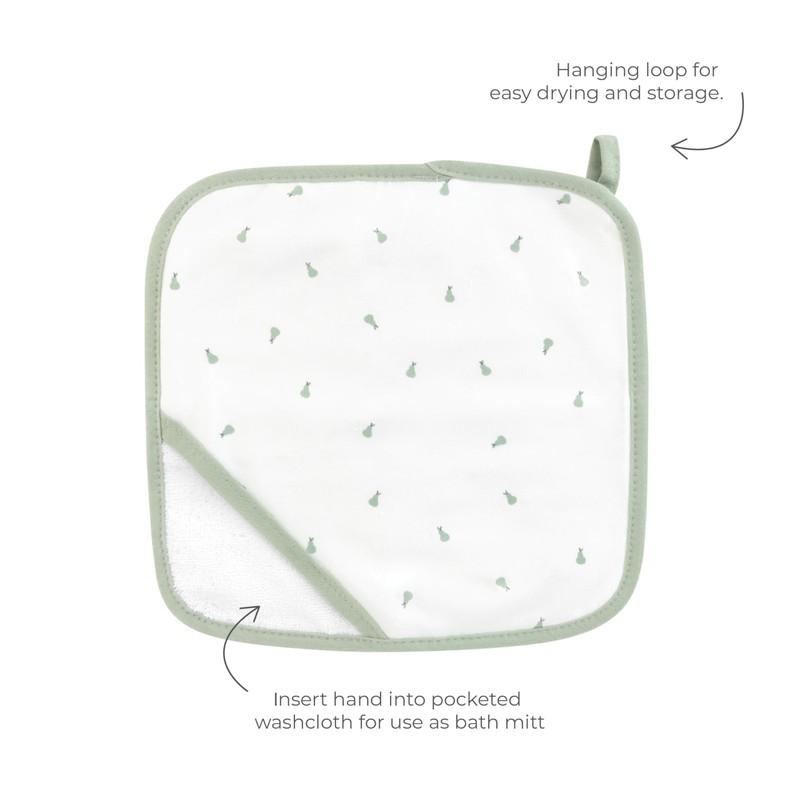 Estos paños ultra acogedores tienen un estampado de pera salvia dulce y caprichoso sobre algodón de punto marfil adornado con un ribete salvia suave y neutro. Clásico, cómodo y diseñado a punto con las últimas tendencias de moda, este juego de baño ultra absorbente es un complemento imprescindible para tu registro de bebé y decoración moderna.