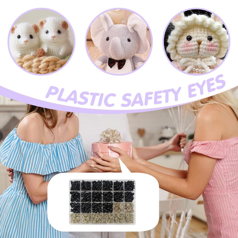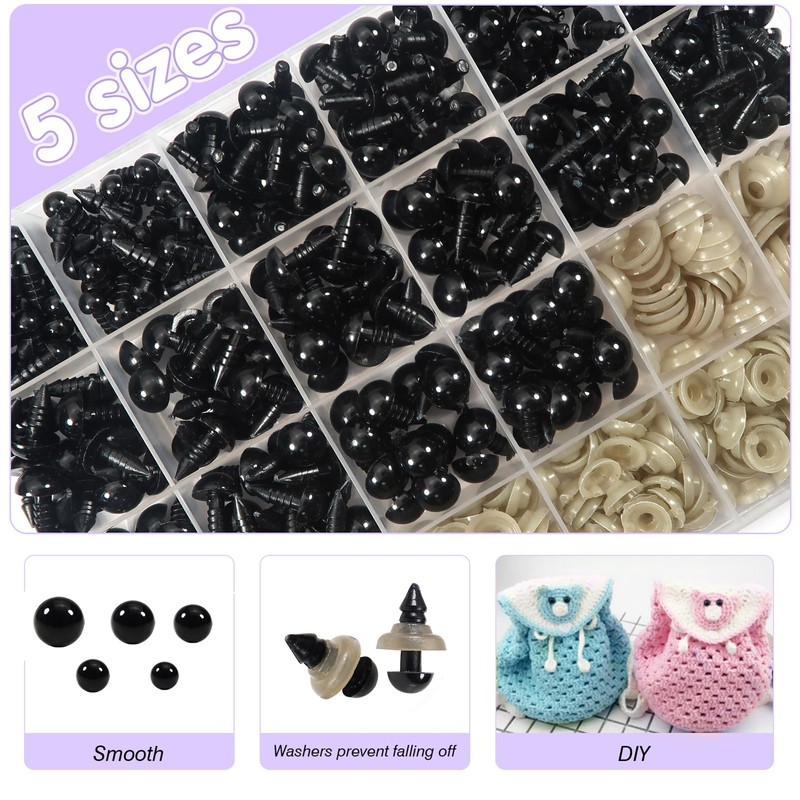 - Package Includes: 300pcs black plastic safety eyes and 300pcs washers in a storage box, convenient to store and carry. Safety eyes diameter: 6 mm,8 mm,9 mm,10 mm,12 mm; Different sizes of safety eyes can meet your different needs, suitable for your different crochet projects or DIY stuffed animals needs